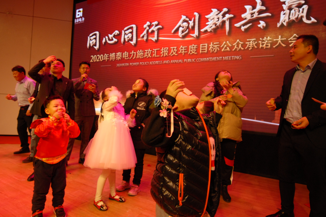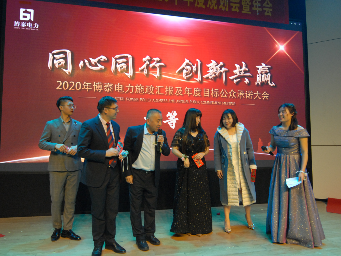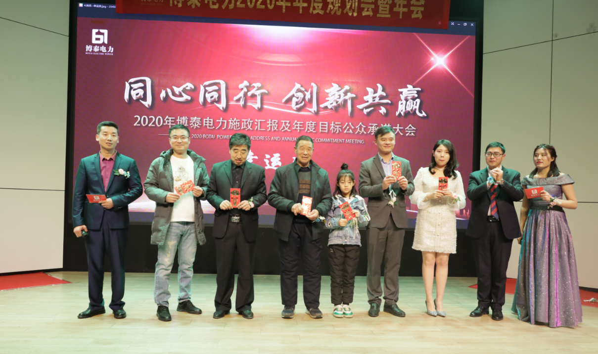 “面对2020年的巨大挑战,我们要一如既往、信心满满、激情满怀,‘金戈铁马闻征鼓,只争朝夕启新程’,我深信在未来的征途中,我们必将所向披靡、满载而归。2019年的博泰电力惊喜无数,2020年的博泰电力必将无数惊喜,我坚信,博泰电力的明天会因在座各位的努力而更加精彩辉煌。