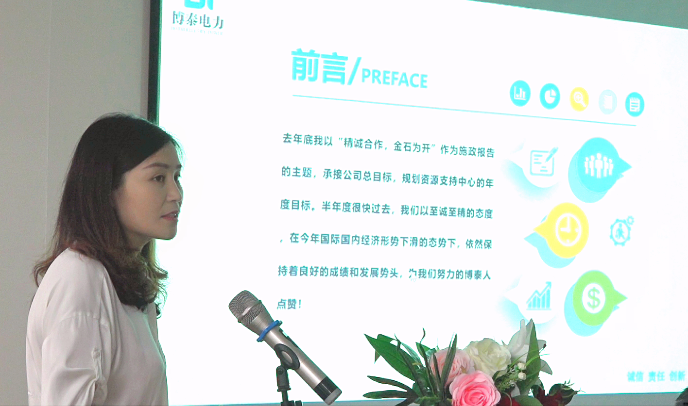 在规划会上,博泰电力总经理陈曦女士对公司上半年的整体发展情况进行了总结和分析,在疫情如此严重的情况下,博泰电力仍然超额完成上半年工作目标,这些成绩离不开每位博泰人的努力,在此感谢所有人的辛勤付出。同时,陈总在会上也指出了目前公司所面临的行业形势以及内部管理所存在的不足,为推动年度战略的实现,公司要紧扣全年目标和长期规划,强化职能管理及组织体系建设,建立、完善、优化及坚决贯彻执行公司及各部门规章制度。各部门间要加强联动,落实责任主体,整合资源,夯实管理,践行高质量发展规划,凝心聚力加速前行,全身心投入到博泰电力的发展建设中来。