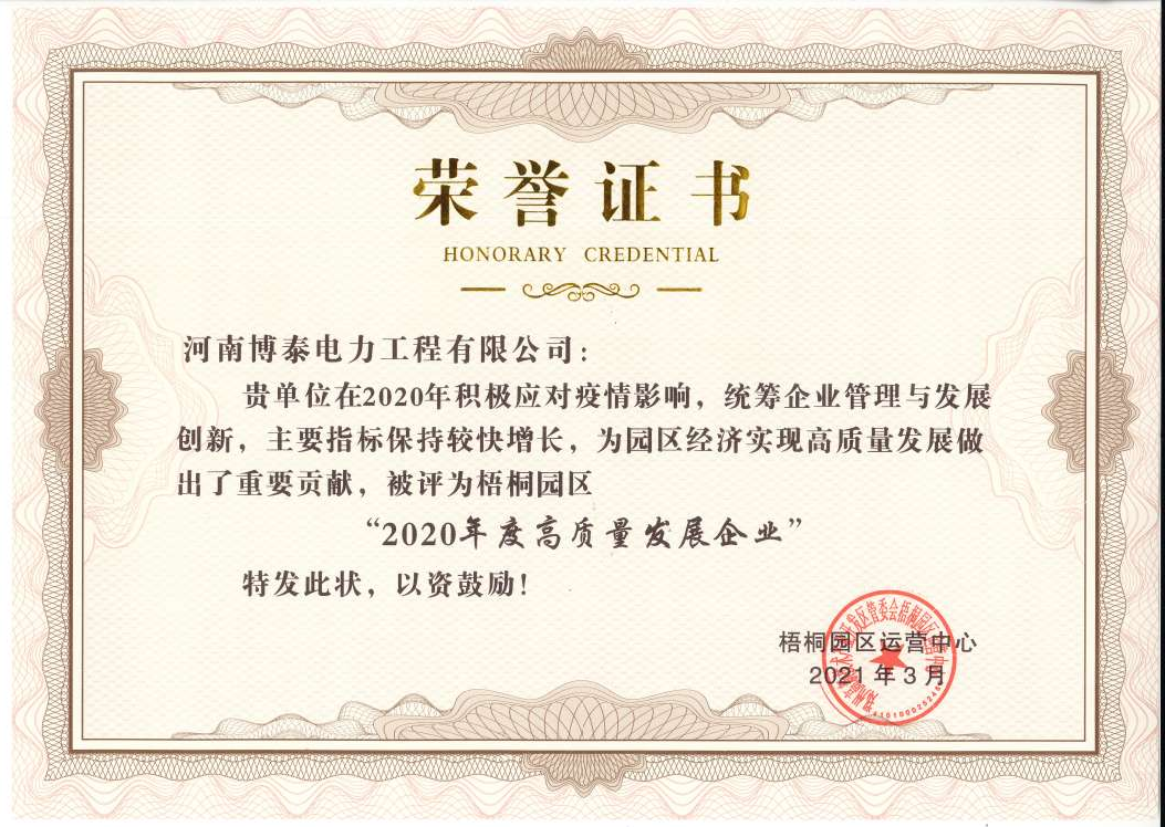 近日,高新区梧桐园区运营中心召开2020年度工作总结暨企业表彰大会,大会对2020年度涌现出的一大批锐意进取、勇于创新、贡献突出的高质量发展企业进行了表彰,博泰电力喜获“2020年高质量发展企业”“2020年度行业领军优秀企业”荣誉称号。