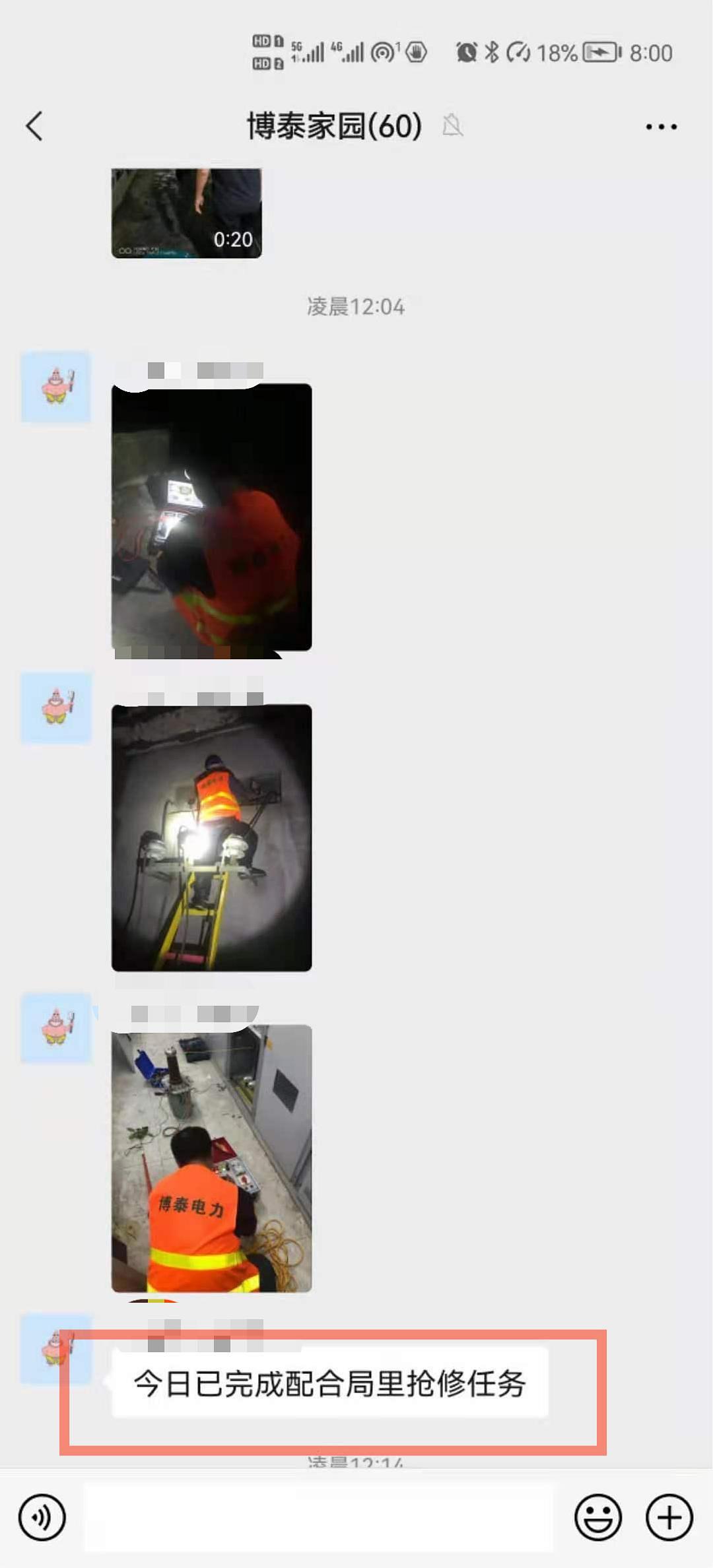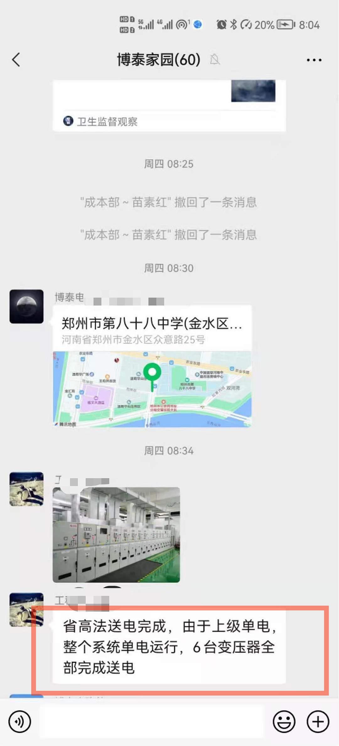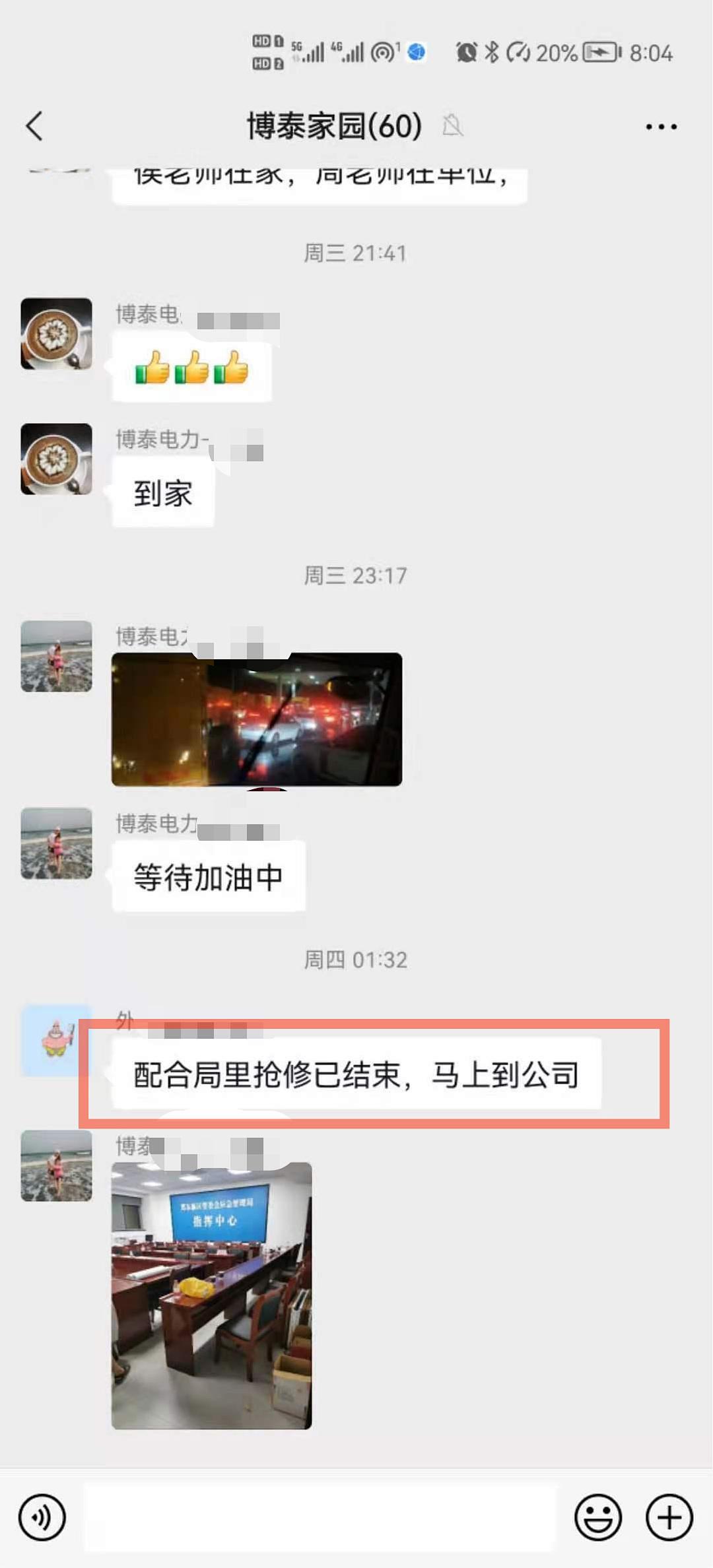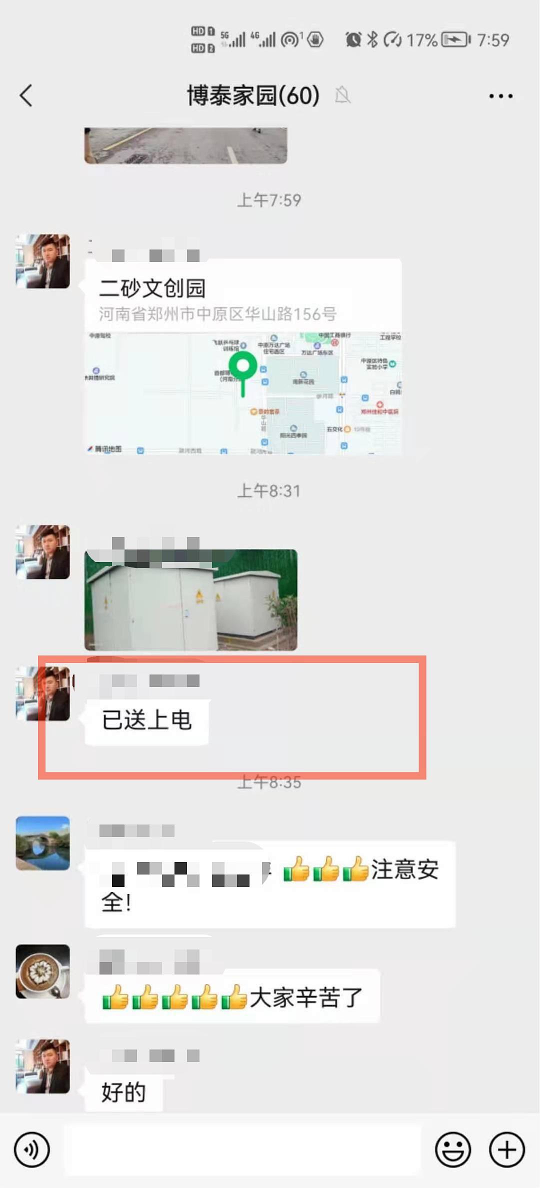 截止到今日,博泰电力已经完成了省医阜外医院、侯寨水厂、郑大三付院、郑州六院、中建二局、郑州中学、中远氨纶、郑州美术馆、金源百荣公司、郑州公交总公司、普罗理想城、永盛家园、书香名筑等地的电力抢修工作,尽我们最大的努力解决客户需求,当一个个送电捷报传来,振奋着我们每个人的心。