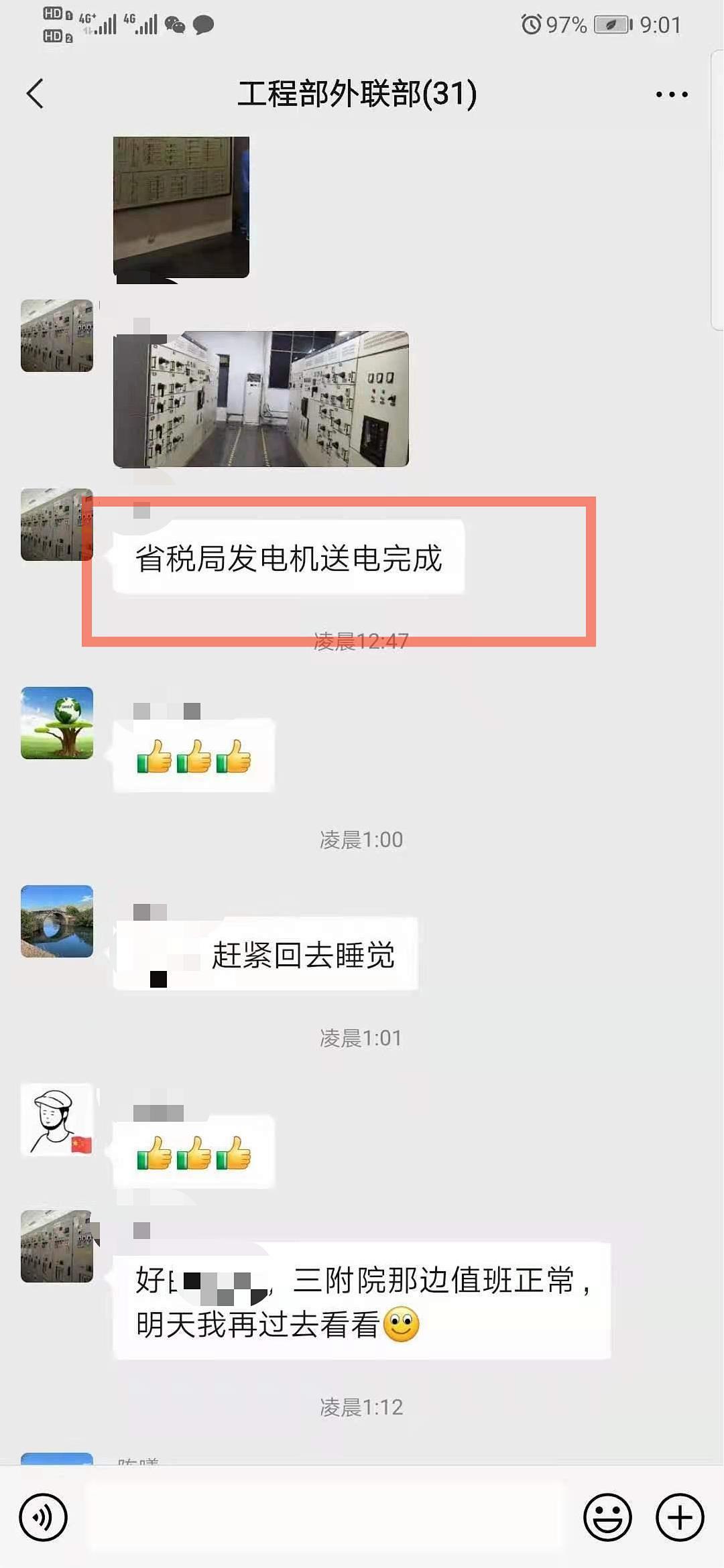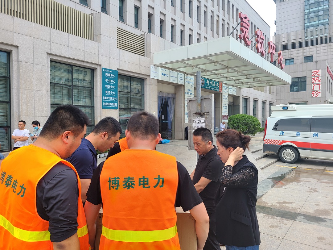 所有停电的设施中,最严重的应该是医院停电。医院收治了大量的重症患者,停电造成很多医疗设施无法使用,从而让患者出现生命危险。时间紧迫,情况刻不容缓,当博泰接到通知,立即调动11辆发电车,紧急驰援郑大一附院河医院区、省医阜外医院、郑大三附院、郑州六院,组织全部工程人员,分成多个小组,全部都入到供电抢修的大军中。