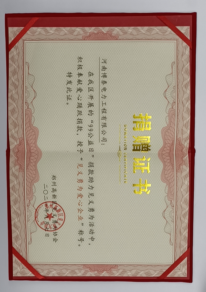“7.20”郑州特大暴雨,对郑州的经济发展和人民生命财产造成了重大损失。博泰电力在拼尽全力抢修保电的同时,也积极为本次抗灾救险行动捐款、捐献物资等。我们的事迹也得到了社会的表扬,被郑州高新区见义勇为协会授予“见义勇为爱心企业”荣誉称号,这是对我公司的鼓励和肯定。