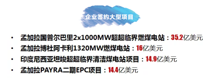 企业签约的大型项目包括:孟加拉国普尔巴里2*1000MW超超临界燃煤电站等,详情如下:
