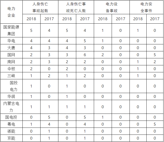 2018年,中国华能、国家电投、中广核、京能集团、浙能集团等5家单位未发生电力人身伤亡事故,其中中广核集团连续两年未发生任何电力事故。下表是按业主单位统计的近两年电力事故对比表,国家能源集团、中国大唐、中核集团、国投电力、华润电力等5家单位人身伤亡事故较2017年同比上升,需引起高度重视。