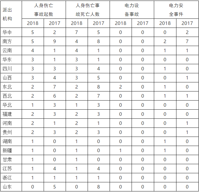 2018年,18家派出能源监管机构中有17家发生电力人身伤亡责任事故,山东区域未发生任何电力事故。下表是按监管区域对责任事故进行了划分,华中、云南、华东、河南、湖南、新疆、甘肃等7个区域电力人身伤亡事故起数较2017年同比上升,南方、山西、东北、西北、华北、福建、贵州、江苏、山东等9个区域电力人身伤亡事故起数较2017年同比下降,其余2个区域事故起数同2017年持平。