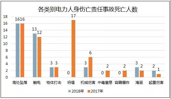 2018年,高处坠落事故死亡16人,触电事故死亡13人,分别占死亡人数的40%和32.5%,是电力事故的主要类别。与2017年相比,坍塌、机械伤害、中毒窒息、容器爆炸等类事故死亡人数大幅下降,触电、淹溺和起重伤害3类事故同比增加,需各企业认真采取措施应对防范。