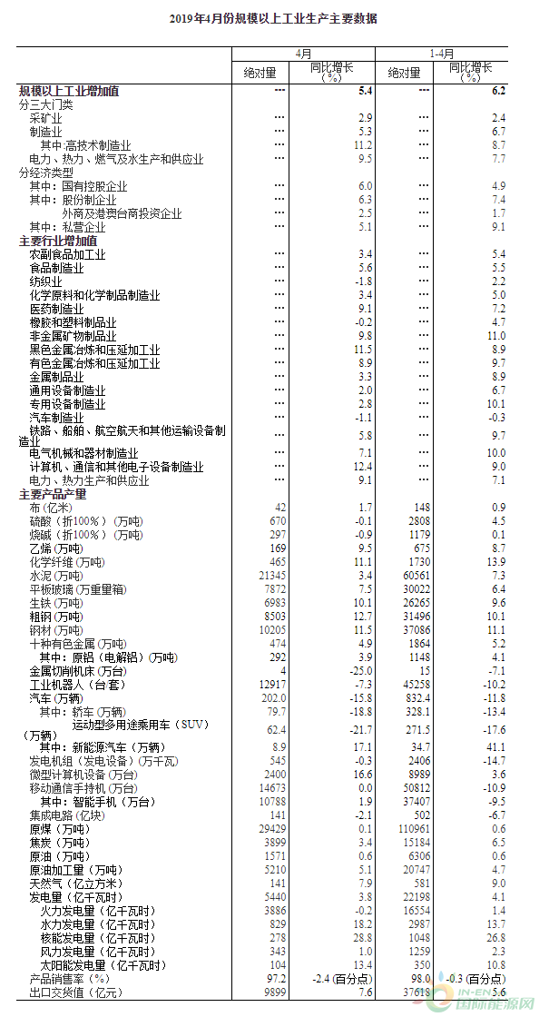 据国际能源网消息 15日,国家统计局发布2019年4月份规模以上工业生产主要数据。