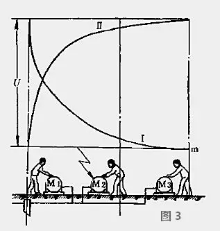 但在生产实际当中,生产中机械设备都设有保护接零,即很多设备外壳通过保护线都连在了一起,若其中有一台设备发生接地故障漏电,其它几台都将带电且电位相同,都是电源相电压,但由于地面电位分布不同,则离这台故障设备越远的设备接触电压越高,触碰到这个设备就越危险。如图所示,三台电动机外壳的接地线连在一起并接地,当左边一台电动机绕组碰壳发生接地故障,其它几台电动机外壳都将带电,左边有人触碰到电动机外壳,承受的接触电压最低,几乎为零;最右边人承受的接触电压最高,接近于电源对地电压,即相电压,也就越危险。见图3所示。